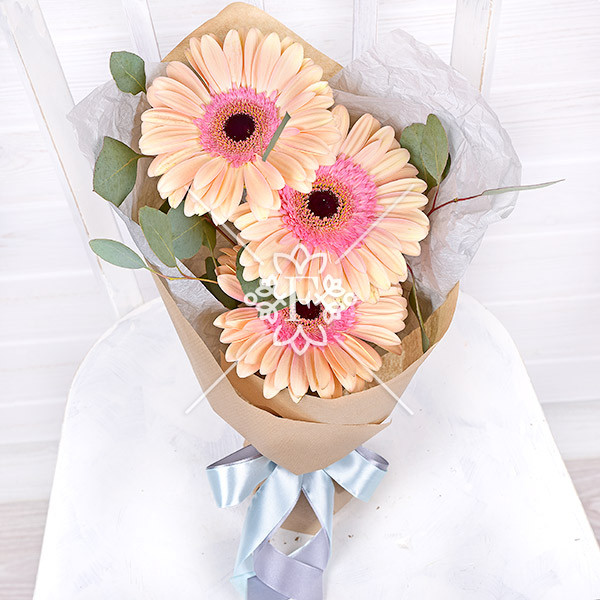 Очаровательные герберы  кремово-розового  оттенка с зеленью эвкалипта выглядят заманчиво, гармонично и нежно.